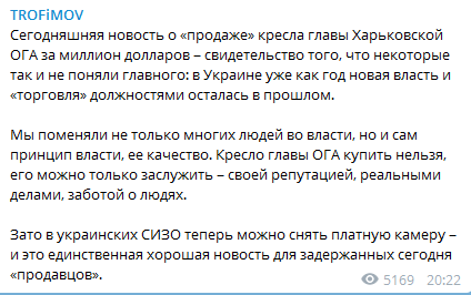 Заместитель главы Офиса президента Сергей Трофимов заявил, что новость о "продаже" кресла главы Харьковской ОГА за миллион долларов – свидетельство того, что некоторые так и не поняли главного: в Украине уже как год новая власть и "торговля" должностями осталась в прошлом. Об этом Трофимов написал в соцсети.