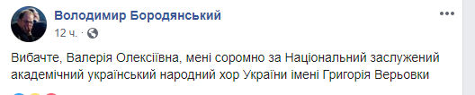"Простите, Валерия Алексеевна, мне стыдно за Национальный заслуженный академический украинский народный хор Украины имени Григория Веревки", - написал Бородянский на своей странице в Facebook в воскресенье вечером.