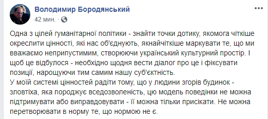 В понедельник министр написал еще одно сообщение, отметив, что в его системе ценностей радоваться тому, что у человека сгорел дом - злорадство, которое порождает вседозволенность.