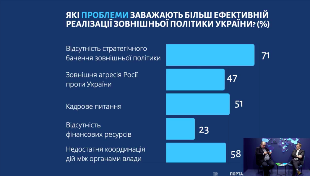 Также эксперты назвали проблемы, которые мешают более эффективной реализации внешней политики Украины. Среди них: отсутствие стратегического видения внешней политики, внешняя агрессия России против Украины, кадровый вопрос, отсутствие финансовых ресурсов, недостаточная координация действий между органами власти. Точные оценки экспертов смотрите на скриншоте или в видео.