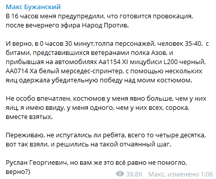 "В 0 часов 30 минут, толпа персонажей, человек 35-40, с битами, представившихся ветеранами полка Азов, и прибывшая на автомобилях Аа1154 ХІ мицубиси L200 черный, АА0714 Ха белый мерседес-спринтер, с помощью нескольких яиц одержала убедительную победу над моим костюмом", -напсиал Бужанский в своем сообщении.