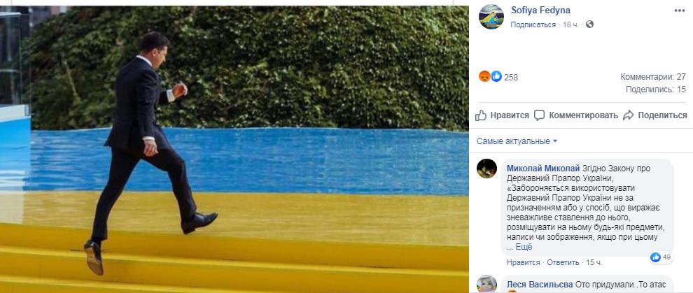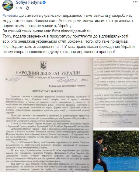 В "Евросолидарности" нардеп Федина подала обращение в Офис генпрокурора расследовать факт надругательство над украинским флагом. В своем обращении нардеп сослалась на три источника в интернете, одним из которых являлся Твиттер президента Зеленского.