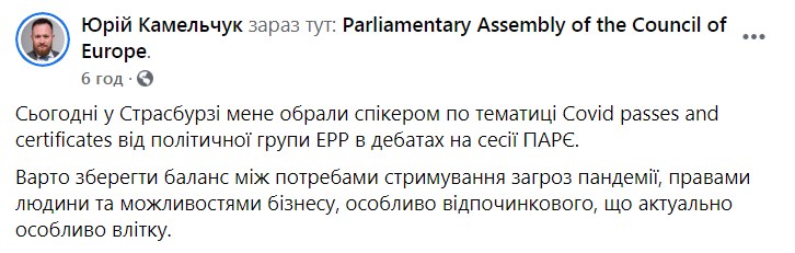 Юрий Камельчук, народный депутат от "Слуги народа", был назначен в ПАСЕ спикером по COVID-паспортов. Он будет контролировать вопросы сертификатов в Парламентской ассамблее Совета Европы.