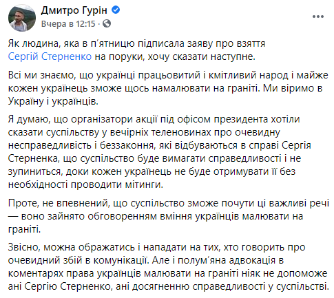 Однако общество не услышало призывы, ведь оно "занято обсуждением умения украинцев рисовать на граните". "Конечно, можно обижаться и нападать на тех, кто говорит об очевидном сбое в коммуникации. Но и пламенная адвокация в комментариях по поводу права украинцев рисовать на граните никак не поможет ни Сергею Стерненко, ни достижению справедливости в обществе", - подчеркнул Гурин.