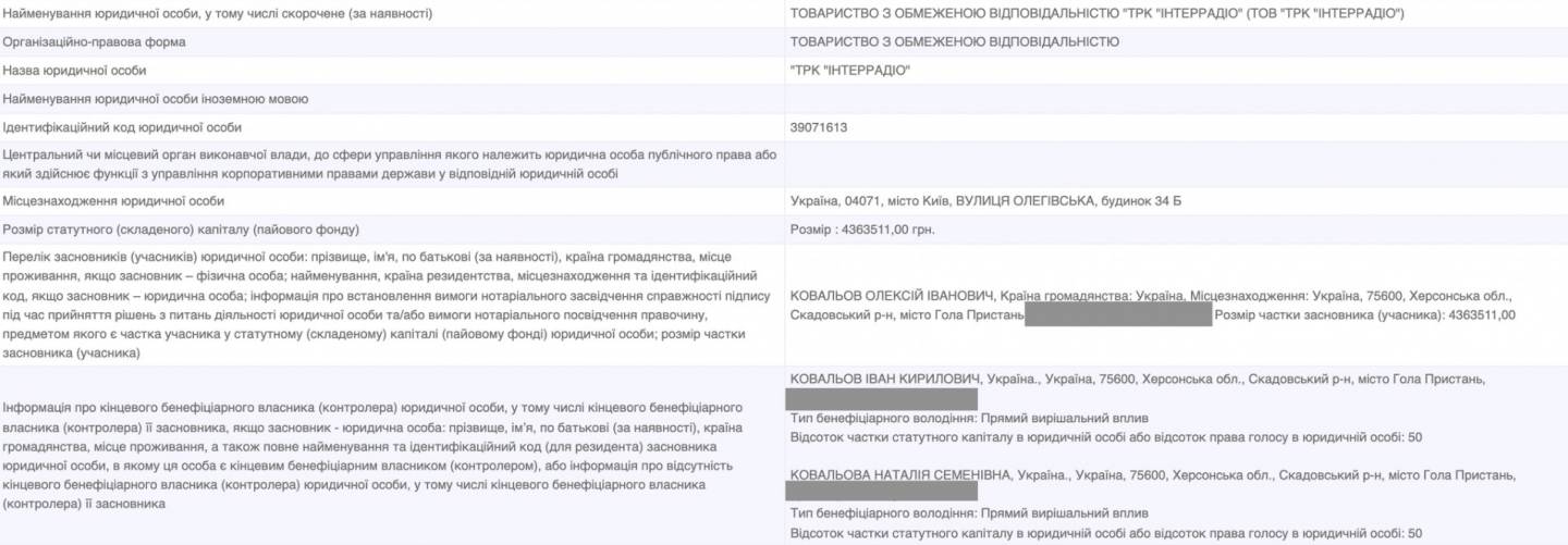 Согласно открытым данным ООО "ТРК "ИНТЕРРАДИО", учредителем юридического лица является именно Алексей Ковалев, доля его собственности 100%. Сумма уставного фонда указана 4363511 грн.