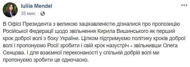 "В Офисе президента с большой заинтересованностью узнали о предложении Российской Федерации по освобождению Кирилла Вышинского как первом шаге доброй воли со стороны Украины.
