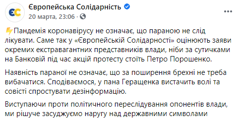 Партия "Европейская Солидарность" обнародовала в соцсети заявление, в котором отметила, что пандемия коронавируса не означает, что паранойю не следует лечить. По мнению партии Порошенко, наличие паранойи не означает, что за распространение лжи не надо извиняться. "Европейская Солидарность" призвала заместителя министра внутренних дел Антона Геращенко опровергнуть дезинформацию. "Выступая против политического преследования оппонентов власти, мы решительно осуждаем надругательство над государственными символами", - заявили в "ЕС".