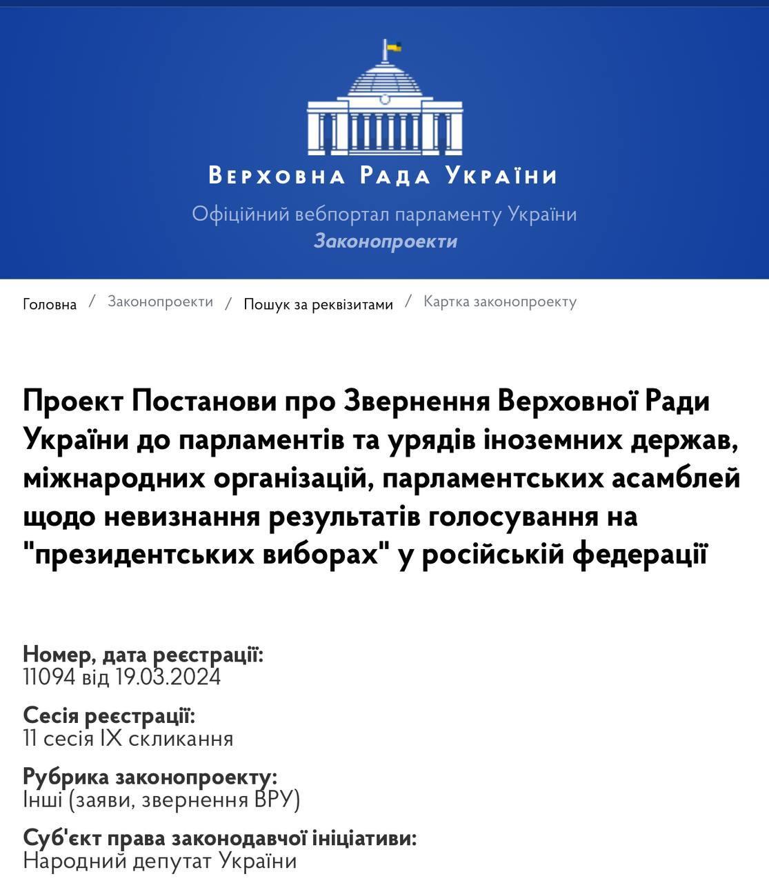 Парламент подготовил и зарегистрировал постановление о непризнании результатов голосования на "президентских выборах" в Российской Федерации