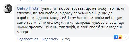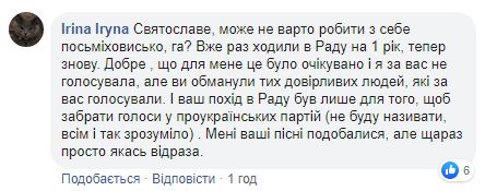 Те, кто не симпатизировал “Голосу” и Вакарчуку как политику, напомнили певцу о том, как настойчиво он боролся за то, чтобы его партия прошла в парламент. При этом его политсила отобрала голоса у других проукраинских партий, потому что избиратели больше верили именно Вакарчуку. “Вы обманули тех доверчивых людей, которые за вас голосовали”, - пишет в комментариях Irina Iryna.
