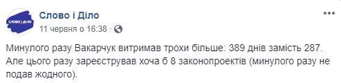 Информационный ресурс “Слово и дело” не поленился подсчитать, насколько дольше Вакарчук продержался второй раз. Журналисты даже подвели итоги его работы.