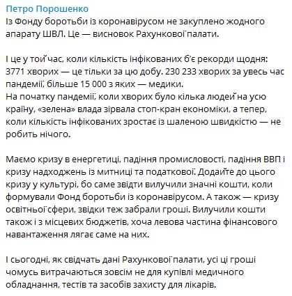 "В начале пандемии, когда больных было несколько человек на всю страну, "зеленая" власть сорвала стоп-кран экономики, а теперь, когда количество инфицированных растет с бешеной скоростью — не делает ничего. Имеем кризис в энергетике, падение промышленности, падение ВВП и кризис поступлений с таможни и налоговой. Добавьте к этому кризис в культуре, потому что именно оттуда изъяли значительные средства, когда формировали Фонд борьбы с коронавирусом. А также — кризис образовательной сферы, откуда тоже забрали деньги. Изъяли средства также и из местных бюджетов, хотя львиная доля финансовой нагрузки ложится именно на них", - сообщил Порошенко в своей публикации 5 октября.