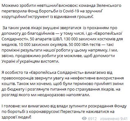 Порошенко также потребовал в своей публикации от правоохранительных органов изучить ситуацию с нецелевой тратой коронавирусных денег. Кроме того, он как лидер "Европейской солидарности" заявил, что его политсила требует изменений в Госбюджете и рассмотрения вопроса о страховании врачей. Также Порошенко потребовал от сегодняшней власти остановить хищение Фонда по борьбе с коронавирусом.