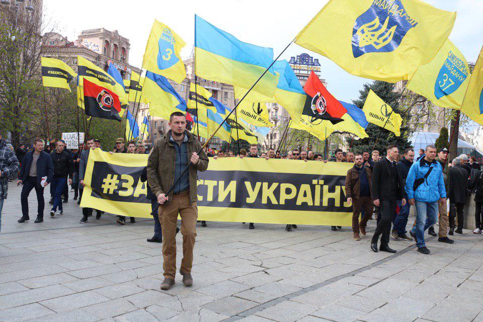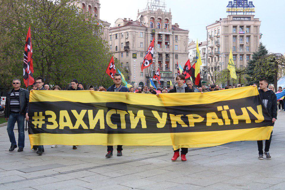 Президент Украины Петр Порошенко возглавил колонну марша "Защити Украину", которая идет с Михайловской площади в НСК "Олимпийский", где сегодня состоятся дебаты между кандидатами в президенты.