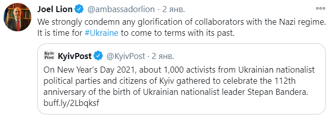 Посол Израиля в Украине Джоэль Лион осудил марш Бандеры, который состоялся в Киеве, и назвал вождя ОУН пособником нацистского режима. Дипломат перепостил новость о марше в честь дня рождения Бандеры, который провели 1 января члены ВО "Свобода" и "Нацкорпус". "Мы решительно осуждаем любое прославление пособников нацистского режима. Время для Украины примириться со своим прошлым", - прокомментировал посол новость о марше.