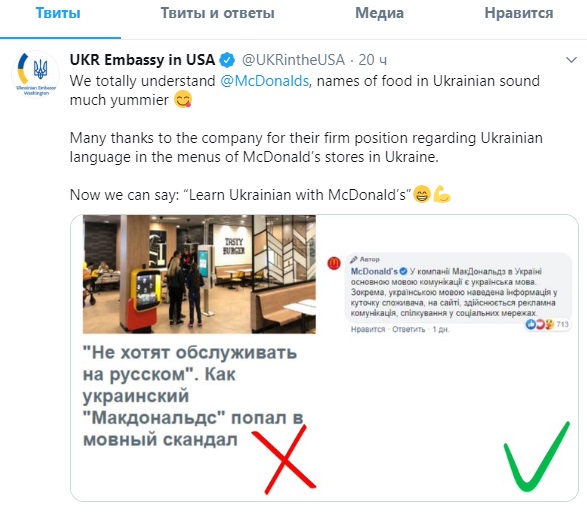 Посольство Украины в Соединенных Штатах выпустило комментарий о решении отсутствия русскоязычного меню в заведениях сети McDonald's, расположенных в Украине. Дипломаты опубликовали комментарий в Twitter