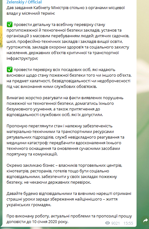 "Требую жестко реагировать на факты выявленных нарушений пожарной или техногенной безопасности, добиваться их безусловного устранения, а также привлечения к ответственности должностных лиц, которые их допустили", - написал Зеленский.
