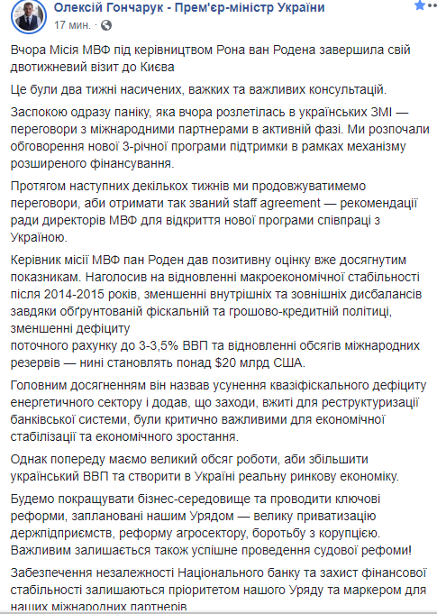 "Успокою сразу панику, которая вчера разлетелась в украинских СМИ - переговоры с международными партнерами в активной фазе. Мы начали обсуждение новой 3-летней программы поддержки в рамках механизма расширенного финансирования. В течение следующих нескольких недель мы будем продолжать переговоры, чтобы получить так называемый staff agreement - рекомендации совета директоров МВФ для открытия новой программы сотрудничества с Украиной", - написал Гончарук.