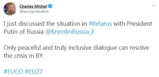 Президент Европейского Совета Шарль Мишель обсудил с президентов Российской Федерации Владимиром Путиным "белорусский кризис". Для решения конфликта, который возник между действующей властью и народом в Беларуси необходим "по-настоящему всесторонний диалог".