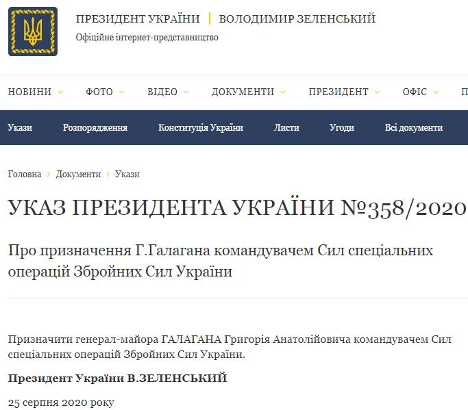 Об этом сообщается на сайте президента Украины. "Назначить генерал-майора Галагана Григория Анатольевича командующим Силами специальных операций Вооруженных Сил Украины", - говорится уже в другом документе №358/2020.