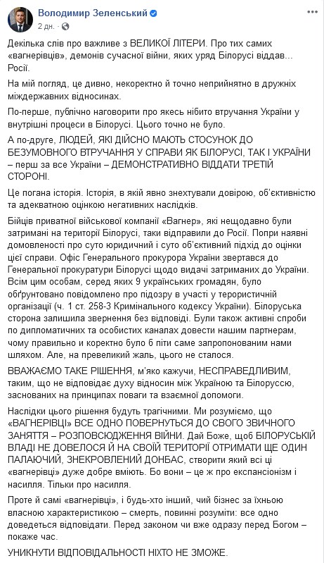 В конце концов к жестким заявлениям относительно событий в Беларуси присоединилась Украина. Сначала в субботу утром Владимир Зеленский в Facebook схерэмоционально отреагировал на решение Лукашенко выдать России 32 бойца частной военной компании "Вагнера", которые принимали участие в войне против Украины на Донбассе. Для подчеркивания большого возмущения часть сообщения Зеленский написал большими буквами. "ЛЮДЕЙ, КОТОРЫЕ ДЕЙСТВИТЕЛЬНО ИМЕЮТ ОТНОШЕНИЕ К БЕЗУСЛОВНОМУ ВМЕШАТЕЛЬСТВУ В ДЕЛА КАК БЕЛАРУСИ, ТАК И УКРАИНЫ - прежде всего Украины - ДЕМОНСТРАТИВНО ОТДАТЬ ТРЕТЬЕЙ СТОРОНЕ... СЧИТАЕМ ТАКОЕ РЕШЕНИЕ, мягко говоря, НЕСПРАВЕДЛИВЫМ, таким, что не соответствует духу отношений между Украиной и Беларусью, основанных на принципах уважения и взаимной помощи", - написал президент.