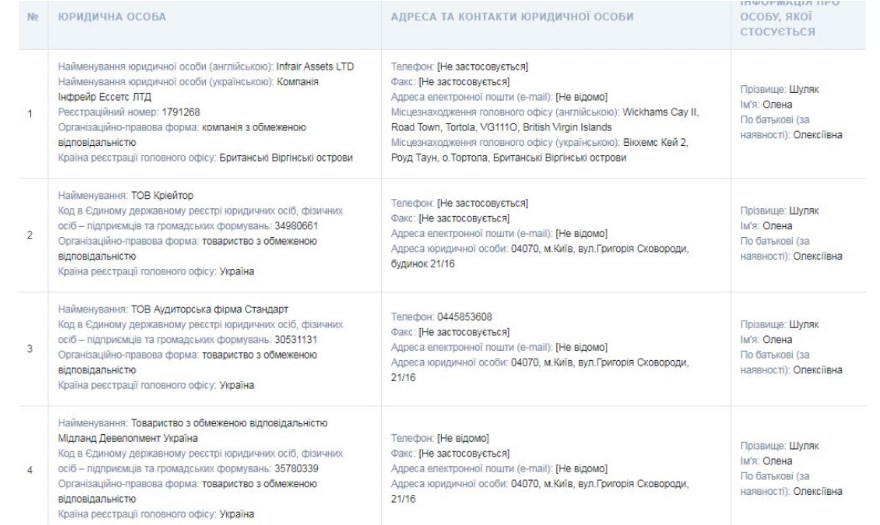 Шуляк является конечным бенефициаром четырех фирм. Одна из них зарегистрирована на Британских Виргинских островах.
