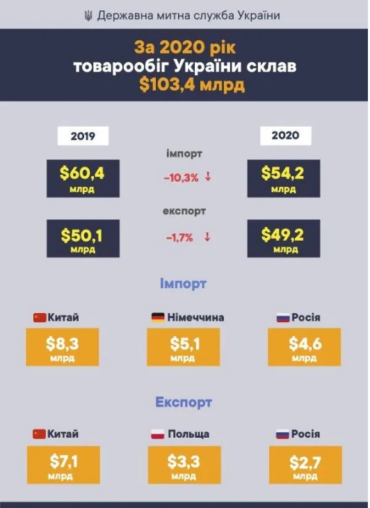 Согласно отчету Государственной таможенной службы, наибольшие объемы товарооборота в нашей стране в 2020 году были с Китаем и РФ. Далее в списке импортеров и экспортеров позиции заняли Германия и Польша.