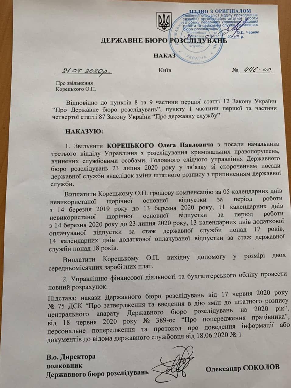 Следователь Государственного бюро расследований Олег Корецкий, который объявил пресс-конференцию и рассказал о давлении со стороны руководства, уволен из-за сокращения его должности - начальника третьего отдела Управления по расследованию уголовных преступлений, совершенных должностными лицами, Главного следственного управления ГБР. Об этом сам Корецкий сообщил УНИАН. Исполняющий обязанности директора ГБР Александр Соколов подписал документ, согласно которому Корецкого увольняют с сегодняшнего дня с должности следователя ГБР в связи с сокращением его должности. Также в документе говорится о выплате Корецкому компенсации в размере двух месячных зарплат и компенсации за неиспользованные дни отпуска.
