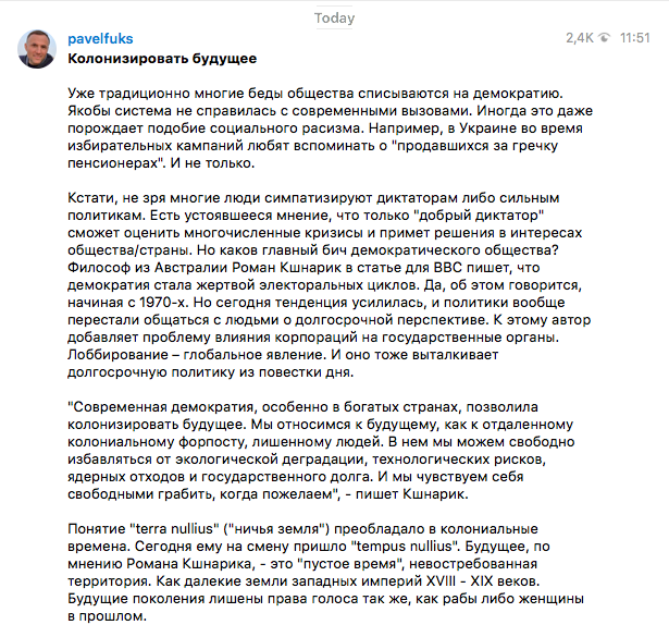 "Современная демократия, особенно в богатых странах, позволила колонизировать будущее. Мы относимся к будущему, как к отдаленному колониальному форпосту, лишенному людей. В нем мы можем свободно избавляться от экологической деградации, технологических рисков, ядерных отходов и государственного долга. И мы чувствуем себя свободными грабить, когда пожелаем", - пишет Кшнарик.