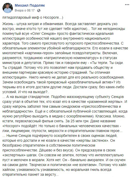"Олег Сенцов - просто фантастически идеальная иллюстрация особенностей нашего внутреннего национального характера. Того самого пресловутого хуторского приспособленчества. С обязательным элементом убойной неблагодарности, – написал Подоляк. – Он безобразно отвратительный в своем политическом приспособленчестве. Дешево и безвкусно. Он предсказуем в своих "экспертных" шагах… он не элита, потому что интеллектуально пустой и мелочный в морали ... он банально аморальный. И он скучный на самом деле ... узнаваемость узнаваемостью, но моральная гниль всегда отвратительно пахнет за версту".