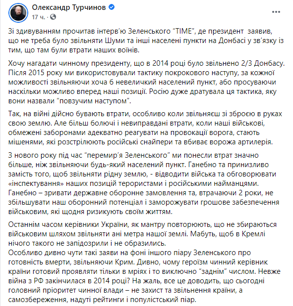 Бывший секретарь СНБО Александр Турчинов прокомментировал интервью президента Зеленского изданию "TIME". Зеленский заявил, что не надо было освобождать Шумы и другие населенные пункты на Донбассе из-за потери военных.