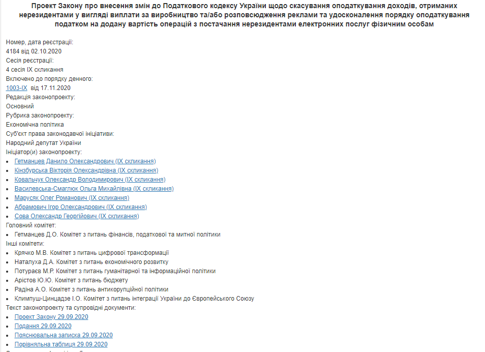 Верховная Рада планирует ввести механизм, который обяжет мировые интернет-компании, которые работают в Украине, платить налоги в государственный бюджет. Такие нормы прописаны в законопроекте №4184, внесенный в повестку дня. Автором законопроекта является нардеп партии "Слуга народа", председатель парламентского комитета по вопросам финансов, налоговой и таможенной политики Данил Гетманцев.