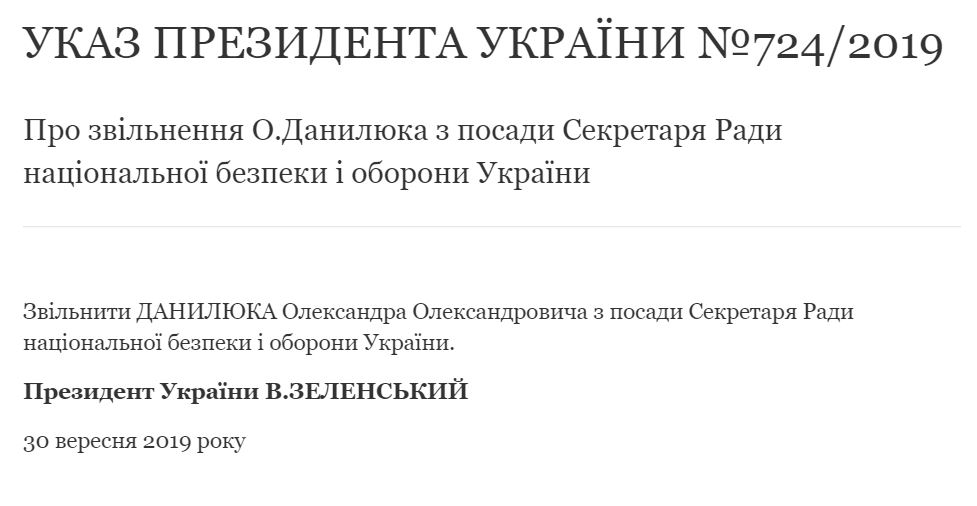 "Уволить Данилюка Александра Александровича с должности Секретаря Совета национальной безопасности и обороны Украины", - говорится в тексте указа.