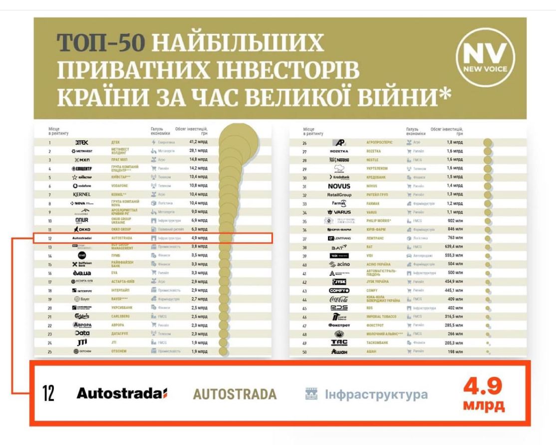 Максим Шкіль повідомив, що компанія Autostrada, яка є лідером інфраструктурного будівництва в Україні увійшла у топ-50 найбільших українських інвесторів. Від початку повномасштабної війни обсяг інвестицій групи компаній Автострада склав 4,9 млрд грн.