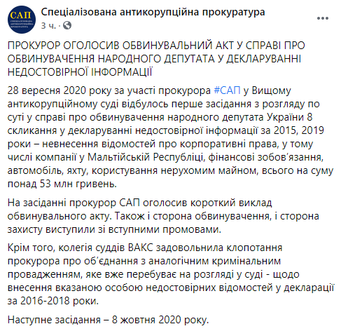 В понедельник, 28 сентября, в Высшем антикоррупционном суде состоялось первое заседание по рассмотрению по существу по делу об обвинении народного депутата Украины 8 созыва в декларировании недостоверной информации на сумму более 53 млн гривен. Об этом сообщает Специализированная антикоррупционная прокуратура. На заседании прокурор САП объявил изложение обвинительного акта, а сторона обвинения, и сторона защиты выступили со вступительными речами.