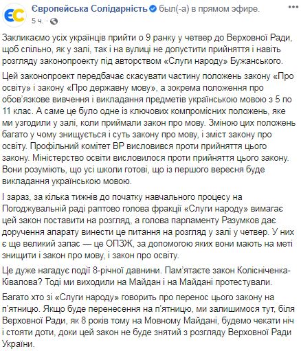 В опубликованном на Facebook сообщении от партии "Евросолидарность" подчеркнули, что законопроект Бужанского влияет на обязательное преподавание в школах на украинским языке ученикам с 5-го по 11 класс.
