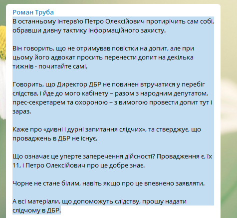 "В последнем интервью Петр Алексеевич противоречит сам себе, выбрав странную тактику информационной защиты. Он говорит, что не получал повестки на допрос, но при этом его адвокат просит перенести допрос на несколько недель - почитайте сами. Говорит, что директор ГБР не должен вмешиваться в ход следствия, и идет в мой кабинет - вместе с народным депутатом, пресс-секретарем и охраной - с требованием провести допрос здесь и сейчас", - заявил Труба.