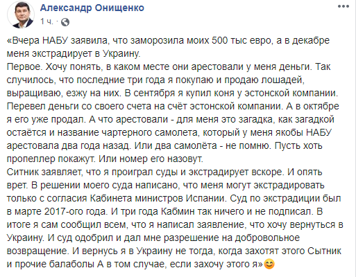 "Онищенко возвращается, ну почти вернулся в Украину. Почему? Потому что он проиграл все суды на территории Испании - и в части экстрадиции, и в части признания его политическим беженцем. Есть определенная ориентировочная дата - это декабрь 2019 года. Конечно, что еще может произойти, но суды он проиграл. Поэтому есть решение о его экстрадиции", - сказал Сытник.