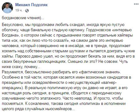Об этом Подоляк написал в Facebook в четверг, 11 сентября, после выхода в свет скандального интервью Андрея Богдана главному редактору издания "Гордон".