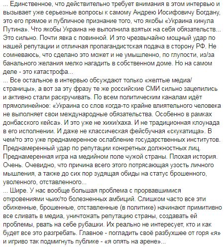 "Единственное, что действительно требует внимания в этом интервью и вызывает уже серьезные вопросы к самому Андрею Иосифовичу Богдану, это его прямое и публичное признание того, что якобы "Украина кинула Путина". Что якобы Украина не выполнила взятых на себя обязательств... Это сильно. Почти явка с повинной. И это чрезвычайно мощный удар по нашей репутации и отличная пропагандистская подача в сторону РФ", - сообщил Подоляк.