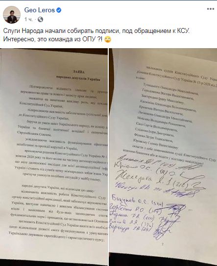 Фото заявления Гео Лерос опубликовал у себя в Facebook во вторник, 3 ноября. В заявлении указано, что народные депутаты, подписавшие это заявление, отмечают значимость работы КСУ как органа конституционной юрисдикции, который обеспечивает верховенство Конституции Украины, а также выступает в качестве весов, которые вносят баланс в систему государственной власти и являются защитниками фундаментальных норм и принципов Основного Закона Украины.