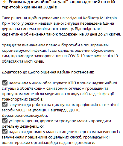 Кабинет министров Украины на заседании 25 марта расширил режим чрезвычайной ситуации на всю страну.