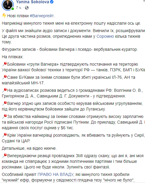 Известная столичная журналистка Янина Соколова на своей странице в Facebook опубликовала новые пленки якобы привлечения украинскими спецслужбами российских наемников из частной военной компании "Вагнера", которые воевали на Донбассе.