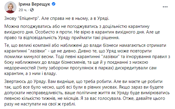 Народный депутат от партии "Слуга народа" и бывший кандидат в мэры Киева Ирина Верещук раскритиковала карантин выходного дня и поблажки от власти для крупного бизнеса, в частности, сети строительных гипермаркетов "Эпицентр". Об этом Верещук написала на своей странице в Facebook.