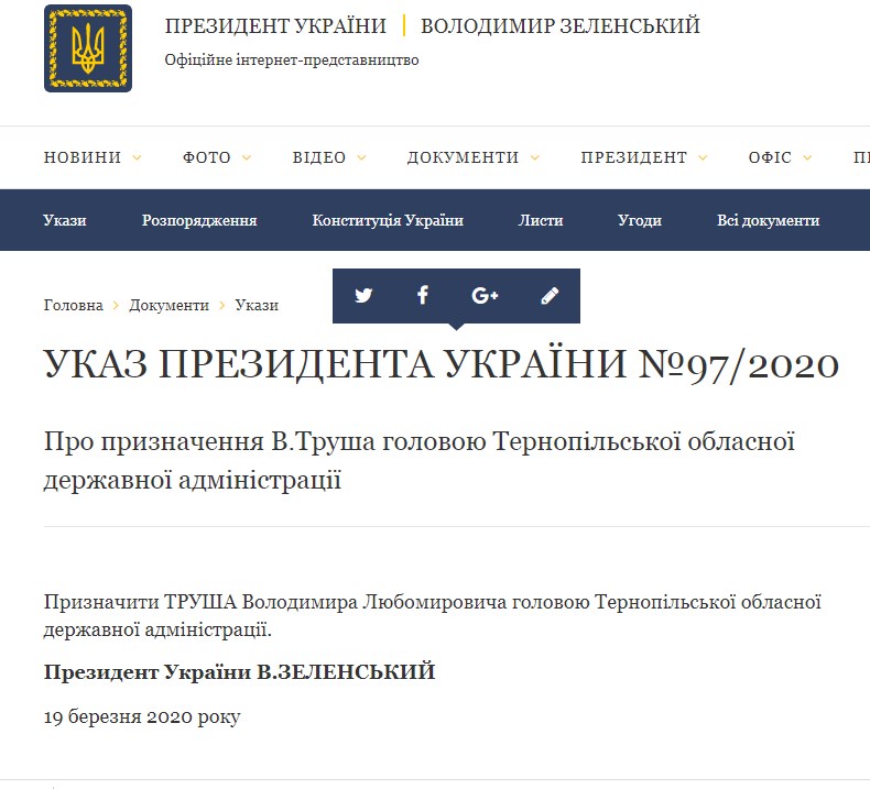 "Назначить Труша Владимира Любомировича главой Тернопольской областной государственной администрации", - говорится в указе президента №97/2020.