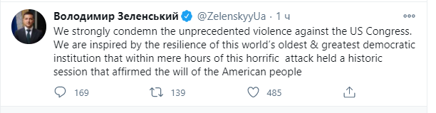 Владимир Зеленский осудил прорыв активистов в Конгресс США и поддержал Конгресс, который после беспрецедентного в истории насилия смог провести историческую сессию.