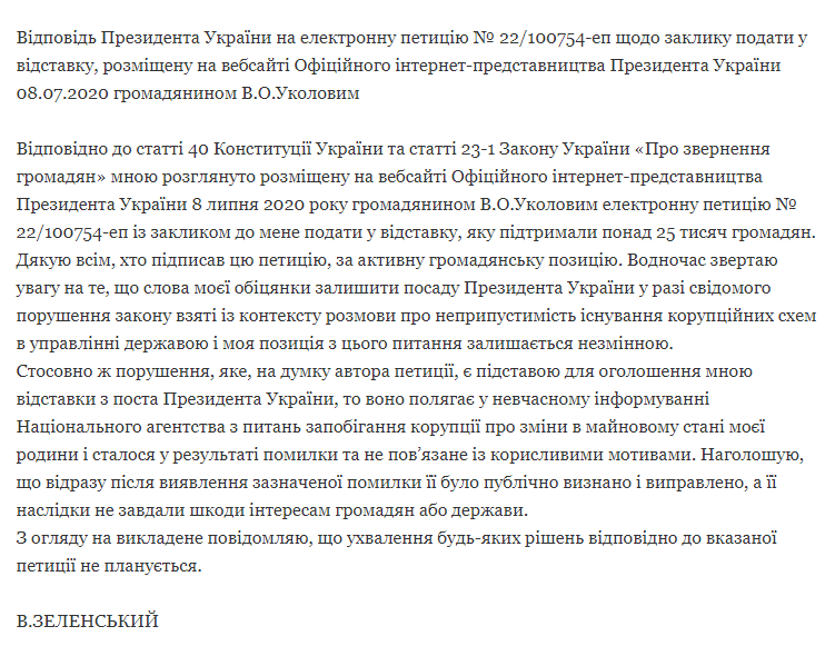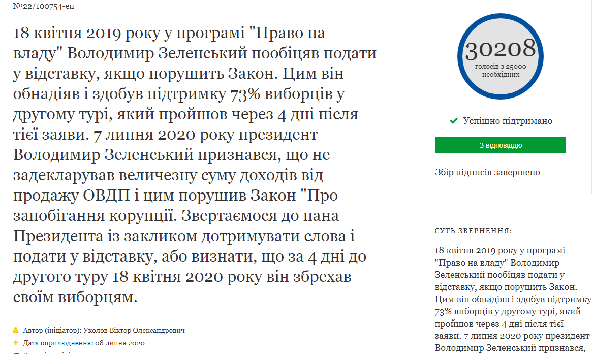 В петиции, инициатором которой выступил политтехнолог Петра Порошенко Виктор Уколов, говорится, что Владимир Зеленский пообещал подать в отставку, если нарушит закон. 7 июля 2020 года Зеленский признался, что не задекларировал большую сумму доходов от продажи ОВГЗ и этим нарушил Закон "О предотвращении коррупции".