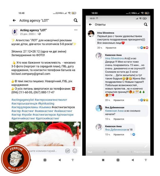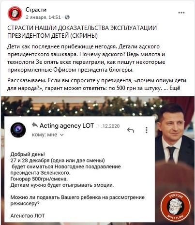 На Facebook-странице группы журналистов - расследователей "Страсти" 2 января был опубликован скандальный материал об организации съемок новогоднего поздравления президента. "Кастинг проводило агентство "Лот", - говорится в сообщении. - В объявлении, которое было опубликовано 25 декабря, указано, что для" новогодней рекламы "нужны девочки и мальчики 5-8 лет". Съемки были запланированы на 27-28 декабря. Для заинтересованных родителей "Лот" в личном сообщении уточнял, что будет "сниматься новогоднее поздравление президента Зеленского. Деткам надо будет играть эмоции".