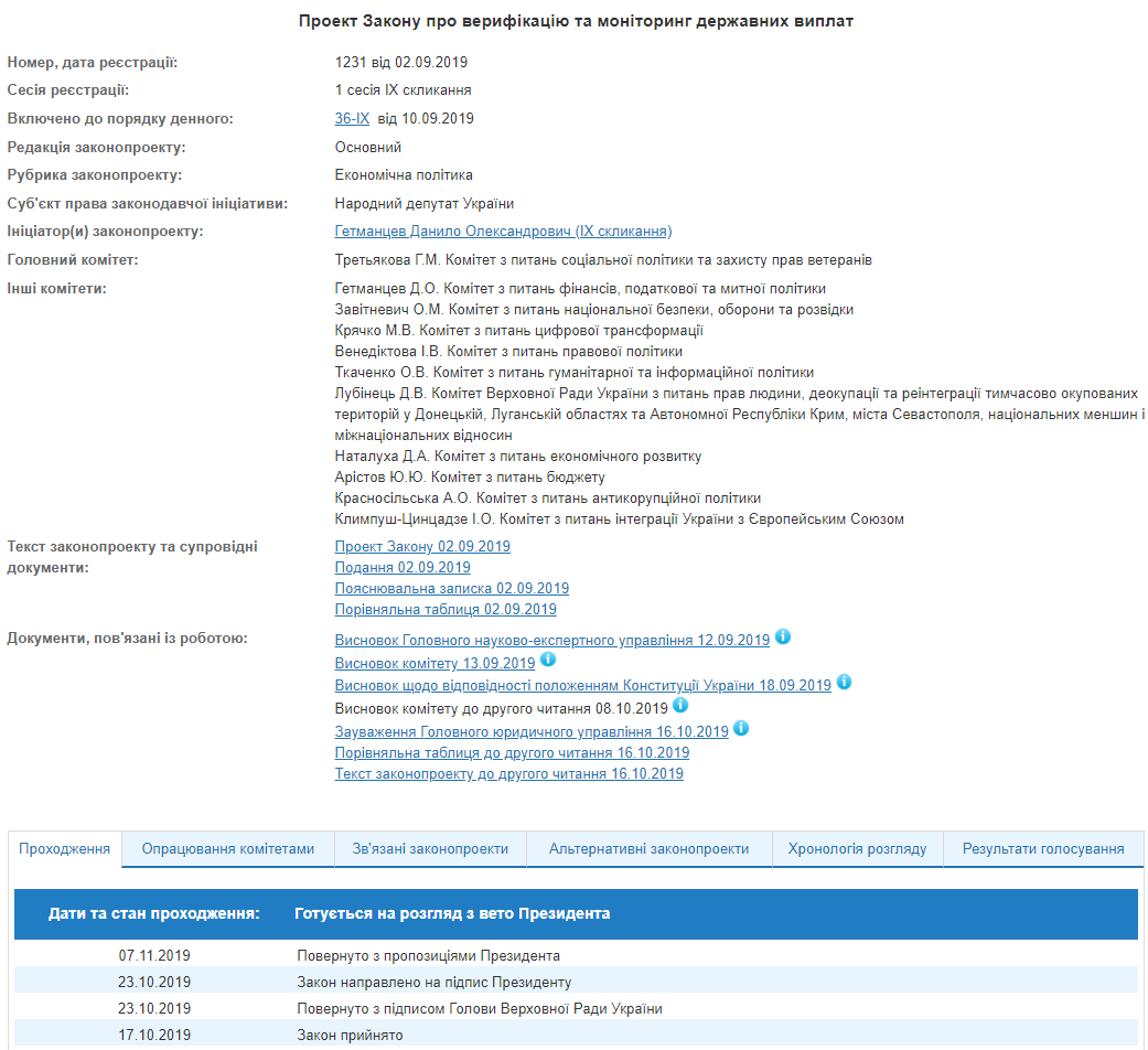 Законопроектом, в частности, предлагалось ввести верификацию государственных выплат - пенсий, пособий, льгот, субсидий, стипендий (кроме академических), других выплат, осуществляемых за счет средств государственного, местных бюджетов, фондов общеобязательного государственного социального и пенсионного страхования. Верификацию таких выплат предлагалось осуществлять в информационно-аналитической платформе.