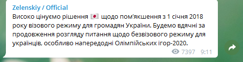 "Высоко ценим решение Японии по смягчению с 1 января 2018 года визового режима для граждан Украины. Будем благодарны за продолжение рассмотрения вопроса о безвизовом режиме для украинцев, особенно в преддверии Олимпийских игр-2020", - написал Зеленский.