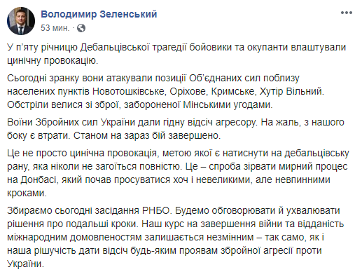 "Сегодня утром они атаковали позиции Объединенных сил вблизи населенных пунктов Новотошковское, Орехово, Крымское, Хутор Вольный. Обстрелы велись из оружия, запрещенной Минскими соглашениями. Воины Вооруженных сил Украины дали достойный отпор агрессору. К сожалению, с нашей стороны есть потери. По состоянию на сейчас бой завершен. Это не просто циничная провокация, цель которой надавить на Дебальцевскую рану, которая никогда не заживет полностью. Это - попытка сорвать мирный процесс на Донбассе, который начал продвигаться хоть и небольшими, но непрестанными шагами", - написал Зеленский.